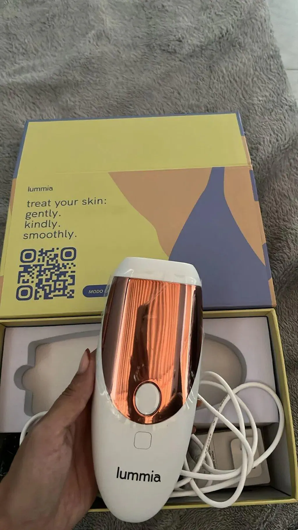 Al comprar tu Lummia IPL Pro recibirás su cable conector, la guía de modo de uso, gafas de protección para las sesiones, las 2 garantías (satisfacción y fábrica) y, por supuesto, tu Lummia IPL Pro.